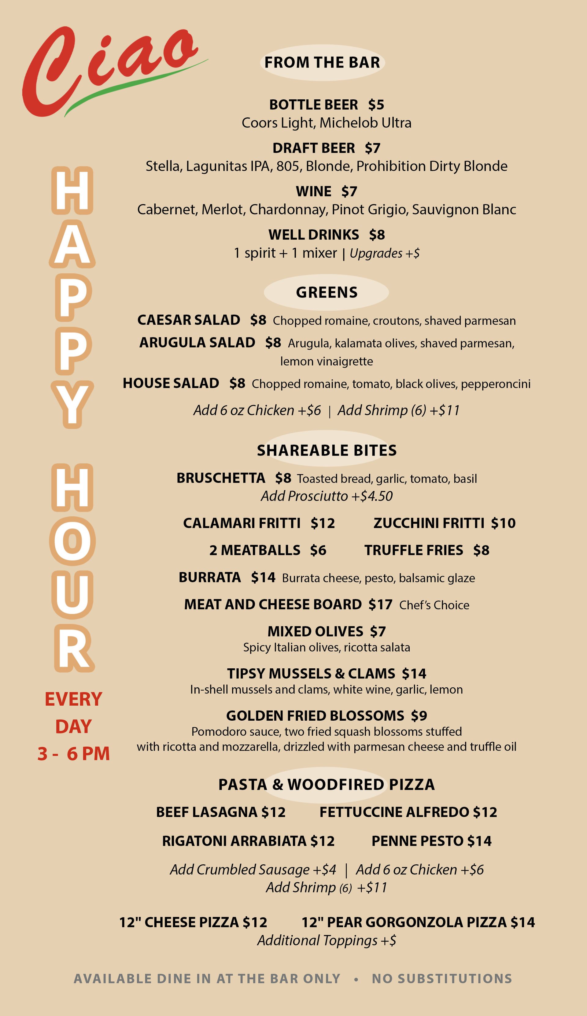 Full Ciao Menu served at both the Ristorante and Enoteca.